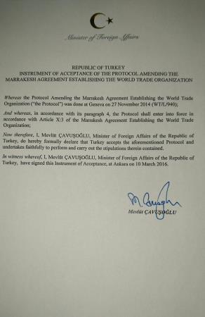 Anılan Protokol'ün yürürlüğe girişle ilgili 4. maddesi ve Dünya Ticaret Örgütü Kuruluş Anlaşması'nın X. maddesi 3. paragrafı uyarınca ve onaylama işleminin tamamlandığının DTÖ’ye iletilmesi teminen hazırlanan kabul belgesi (Instrument of Acceptance), 16 Mart 2016 tarihinde Genel Direktör Yardımcısı Yi Xiaozhun’a tevdi edilmiştir.